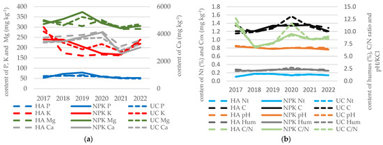 The time development of selected (a,b) main chemical properties of the soil (the content of Nt, P, K, Ca, Mg, C-ox, and Humus, and pH/KCl and C/N ratio, according to treatment (HA, NPK, and UC).