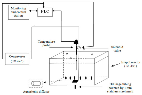 For temperature control, the airflow injected into the lower part of each reactor was regulated. For this, solenoid valves were used considering an average airflow of 1 dm3·min−1, while an airflow of 3 dm3·min−1 was considered if the temperature was higher than 55 °C. Data recording was carried out using System Control and Acquisition Data (SCADA) (Scadata, Inc., Mobile, AL, USA) [31].