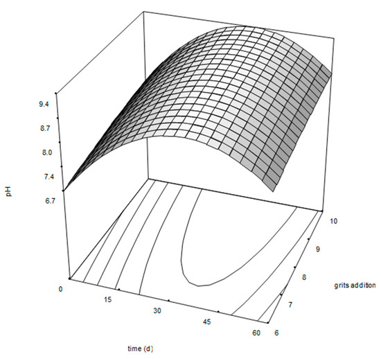 The response surface shows the variation of pH regarding the number of grits added and the composting process time. As observed in Figure 3, the composting process time presents a greater influence on the pH in comparison with the added grits. The same was observed with dregs addition [32]. Initially, the pH ranged from 6.7 to 7.3 for all the mixtures. Between 6 and 10 days, the pH reached a maximum (8.0) during the thermophilic phase. In the response surface, a maximum pH (8.2) is observed during the 50–60-day maturation phase for grits addition. Then, the pH slightly decreased to reach final stable values in the 8.8–9.1 range for all the mixtures. These pH values satisfy the 5.0‘8.5 established by the Chilean Standards for Composting ’Norma Chilena 2.880—Compost: Clasificación y requisitos’, which is applicable to all types of compost [46].