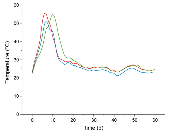 Figure 4 shows the temperature evolution during the process. Our experience shows a comparable pattern to that found in many other composting systems [47]. All reactors kept temperatures between 45 °C and 56 °C for about 10 days, with a subsequent decrease in environmental conditions.