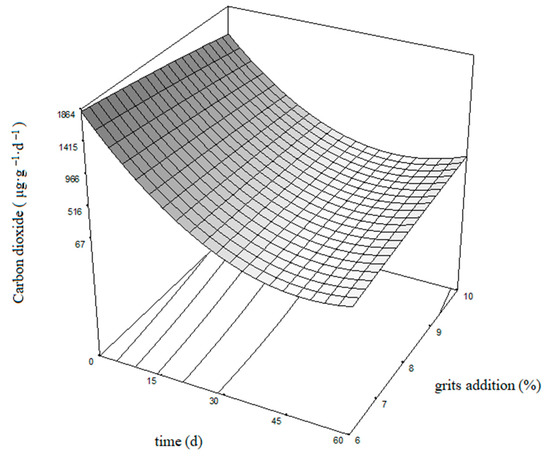Otherwise, the released CO2 evolution was analyzed as a function of the actual values of grit addition and composting process time, with the following empirical relationship: