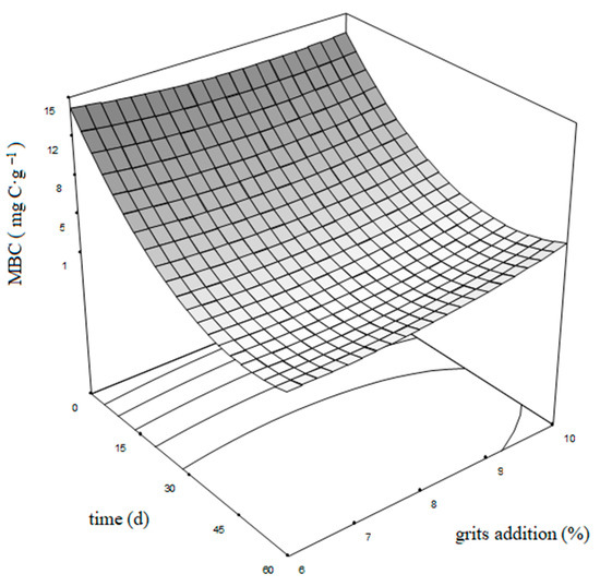 The ANOVA of the quadratic regression function demonstrates the suitable statistical significance of the model. The F-value of 85.6 (p-value ≤ 0.05) demonstrates that this regression was statically significant at a 95% confidence level. The model goodness-of-fit was checked by a 99% R2. Thus, the model fails to explain the 1% of variations in the response only. Figure 6 shows how the MBC is more affected by the composting process time than the grits addition in its linear and quadratic form. During 40 days, the MBC changes fluctuated between 9 to 15 mg·g−1, which is similar to the 5–12 mg·g−1 range informed by Charest et al. [52] for the first half of the composting period. MBC stabilized at values close to 4 mg·g−1, which is equivalent to the 3 mg·g−1 and 5 mg·g−1 described by Gattinger et al. [49] and Hellmann et al. [53], accordingly.