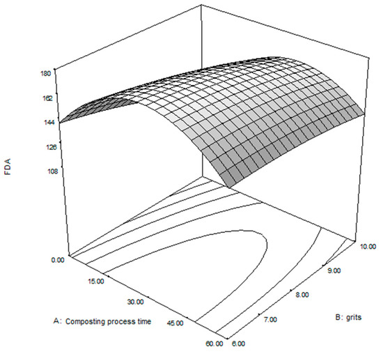 The effect of grits addition and composting process time on FDA hydrolytic activity is represented for the following second-order polynomial function: