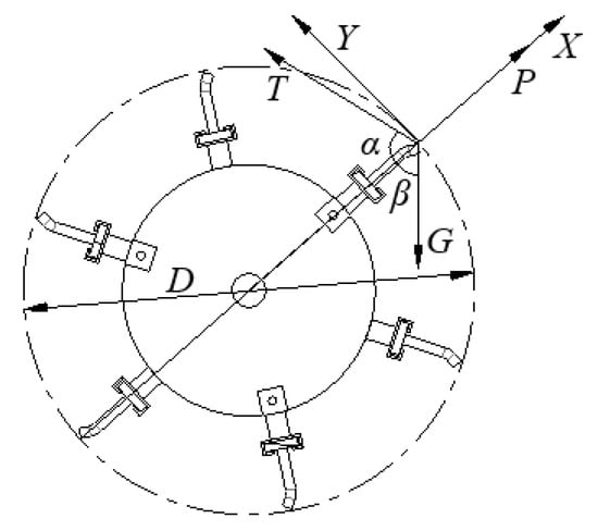 where P is the centrifugal force on the peanut root disk, N; T is the tensile force on the peanut root disk, N; G is the gravity on the peanut root disk, N; α is the radial angle between T and the roller, (°); β is the radial angle between the gravity on the peanut root disk and the roller, (°); m is the mass of the peanut root disk, kg; ω is the angular speed of the roller, rad/s; and D is the roller diameter, mm.