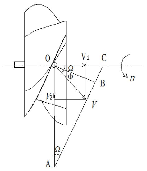 As a core component of the screw-feeding stirrer, the screw-feeding blade is a crucial factor affecting the feeding performance of the peanut root disk. After the peanut root disk enters the screw-feeding stirrer, it moves toward the pod-picking mechanism at the rear under the action of the screw-feeding blade. The peanut root disk is subjected to axial and radial forces in the screw-feeding stirrer so that the peanut root disk has axial velocity V1 and circumferential velocity V2. The velocity analysis diagram is shown in Figure 6.