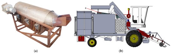Peanut pod-picking device. (a) Peanut root disk full-feeding longitudinal axial flow pod-picking device. (b) Combine harvester for both peanut seedlings and peanuts (a is the Peanut root disk full-feeding longitudinal axial flow pod-picking device).