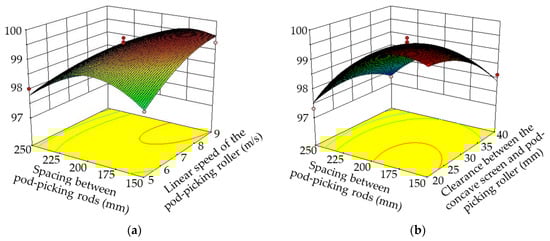 The test data are processed using Design-Expert. By fixing any factor at the zero level, we obtain the dual-factor response surfaces of the pod-picking performance indicators, as shown in Figure 9.