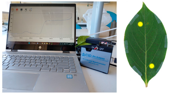 Leaf reflectance measurements were performed in the laboratory, employing a portable CI-710 Miniature Leaf Spectrometer (CID Bio-Science, Inc., Camas, WA, USA), which is shown in Figure 2 (left panel). Two spectral recordings were performed per leaf, one near the tip of the midrib and the other near the petiole, but always at an inter-nervation point. Spectral measurements were taken in the Vis-NIR range from 430 to 1040 nm in steps of 2.6 nm (232 values). Both spectra were averaged to obtain a single representative reflectance spectrum per leaf. Figure 2 shows the arrangement for the spectral recording, highlighting the points of measurement on the leaf (Figure 2, right). The reflectance data were acquired using the software Spectra Snap! v1.1.3.150 (CID Bio-Science, Inc., Camas, WA, USA).