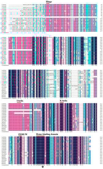 Multiple alignment of F5H amino acid sequences. The amino acids conserved in all the sequences are shaded in black. Sequence identity ≥75% is shown in pink, and sequence identity ≥50% is shown in blue. The signature motifs in P450 proteins, including the proline-rich membrane hinge, the AGxD/ET (I-helix), the KETRL (K-helix), the PERF/W and the heme-binding domain, are indicated by solid red bars. The black pentagram marks the cysteine residue important for heme binding. Details of the F5H sequences are shown in Table S3.