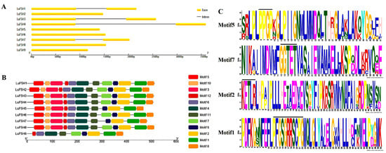 Gene structure and motif analysis of LuF5Hs. (A) Exon-intron structure of LuF5H genes. Exons are represented by yellow boxes, and introns are represented by black lines. (B) Motif composition of LuF5H proteins. Different colored boxes indicate different motifs. (C) Sequence logos of the conserved domains in cytochrome P450 proteins. The typical motifs of the proline-rich membrane hinge (Motif5), the I-helix (Motif7), the K-helix (Motif2) and the heme-binding domain (Motif1) are marked by solid bars, respectively. Details of each motif are provided in Supplementary Material S1.
