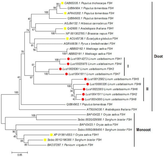 Phylogenic tree of F5H orthologs. The phylogenetic tree was generated using the neighbor-joining method of the Mega7 program. Bootstrap support was based on 1000 replicates. The red dots represent Linum usitatissimum F5H, and the yellow squares are genetically characterized F5H. The F5H sequences of Sorghum bicolor and Linum usitatissimum were obtained from the Phytozome database, and the other F5H sequences were downloaded from the NCBI.