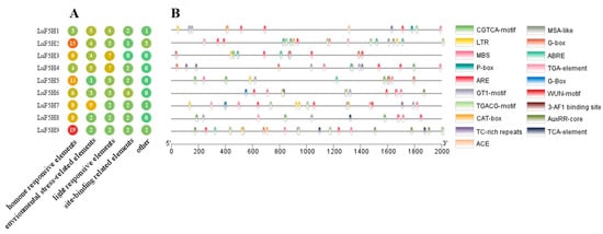 Cis-acting elements in LuF5H promoters. (A) Each LuF5H promoter contains the number of cis-acting elements detected, which are divided into four types. (B) Visualization of hormone-responsive elements in the LuF5H promoters by TBtools.