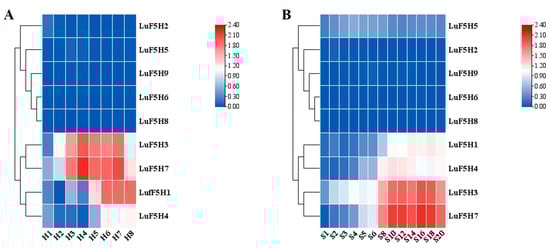 Expression patterns of LuF5H genes in flax. (A) Different developmental stages: H1 seedling stage, H2 fir-like stage, H3 early fast-growing stage, H4 fast-growing stage, H5 bud stage, H6 flowering stage, H7 green stage, and H8 maturity stage. (B) Different parts: flax stems of fast-growing stage were divided into 20 equal parts that were named S1–S20. S1 is closest to the shoot apex, and S20 is closest to the root. Red represents a high expression level, and blue represents a low expression level.