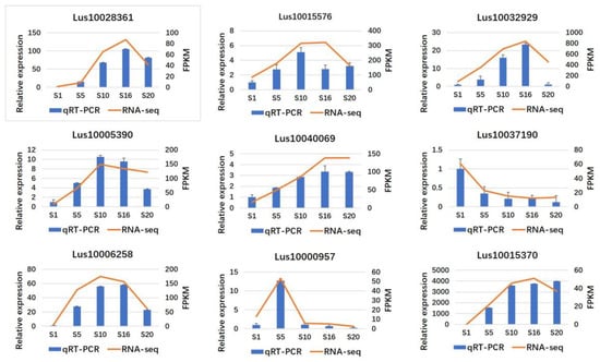 The transcriptome data in different parts of flax stem were further validated via the qRT-PCR analysis of nine genes. The nine randomly selected genes included LuF5H3 (Lus10028361), LuFOMT1 (Lus10015576), LuFOMT2 (Lus10032929), Lu4CL (Lus10005390), LubZIP (Lus10040069), LuTCP15 (Lus10037190), LuGOMT (Lus10006258), Expansin (Lus10000957) and LuZF-HD (Lus10015370). It can be seen from Figure 6 that the change trend of the nine genes is consistent with the RNA-seq data, indicating that the RNA-seq data are reliable. The accuracy of transcriptome data at different developmental stages has been verified by Yuan et al. [2].