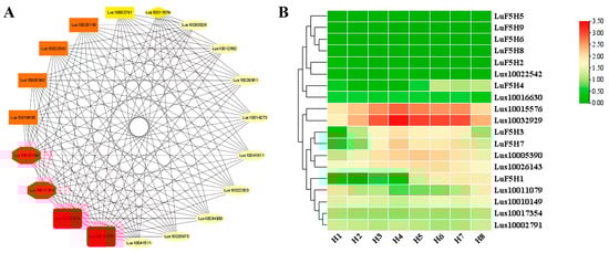 PPI networks of F5H proteins and interacting protein expression patterns in flax. (A) PPI networks of F5H proteins in flax. Different shapes represent different functions of proteins. The ellipse is the LuF5H protein to be studied, and the colors from yellow to red indicate a greater proportion of this protein in the PPI network. (B) Interacting protein expression patterns. The periods represented by H1–H8 are shown in Figure 5. Red represents a high expression level, and green represents a low expression level.