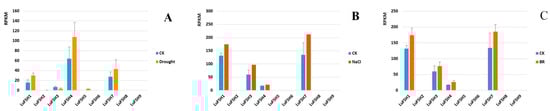 Expression patterns of LuF5H genes in response to various abiotic stresses: (A) drought treatment; (B) NaCl treatment; and (C) BR treatment. The data were obtained from the RNA-seq data (RPKM). The average expression value was calculated by repeated calculations of three independent replicates.