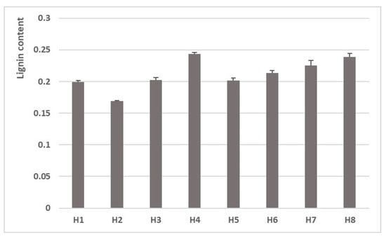 Lignin content in flax at different developmental stages. The periods represented by H1–H8 are shown in Figure 5. Lignin content data were obtained from Yuan et al. [2].