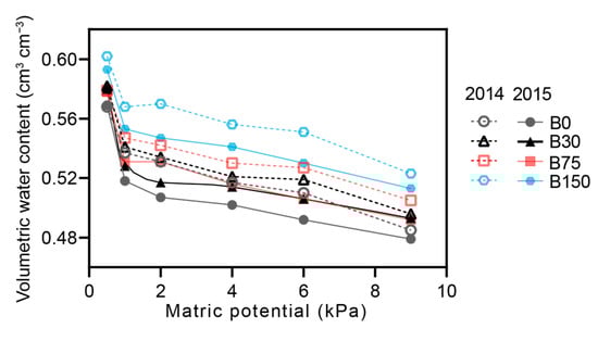 Biochar application resulted in a reduction in soil bulk density ranging from 1.34 to 22.82% over the three-year experimental period, depending on the amount of biochar added and the duration of the amendment (Table 1). The degree of reduction in bulk density was found to be positively correlated with the amount of biochar applied. For instance, the bulk density in B150 decreased by 22.82% in the first year, and by 10.37% and 9.35% in the second and third year, respectively, compared to the control soil (B0). Biochar application also led to an increase in soil volumetric water content by 0.74–11.99% compared to B0 (Figure 1). The increase in soil volumetric water content was more pronounced with higher biochar application rates. Specifically, in B150, the soil volumetric water content reached up to 0.55 cm3 cm−3 at a matric potential of 6 kPa, an increase of 11.99% and 7.72% in 2014 and 2015, respectively, compared to B0. The improvement in soil water retention was sustained for two years but decreased in the second year.