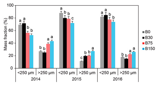 Changes of mass fractions of macro-aggregate (>250 μm) and micro-aggregate (<250 μm) from 2014 to 2016 in the soils amended with biochar at various rates. Different letters represent significant difference among the treatments at the same sampling day (p < 0.05).
