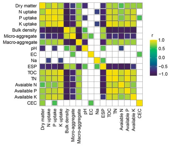 Correlation matrices between maize productivities and soil properties across all the treatments as revealed by Pearson’s rank correlation analysis. All squares represent p < 0.05.