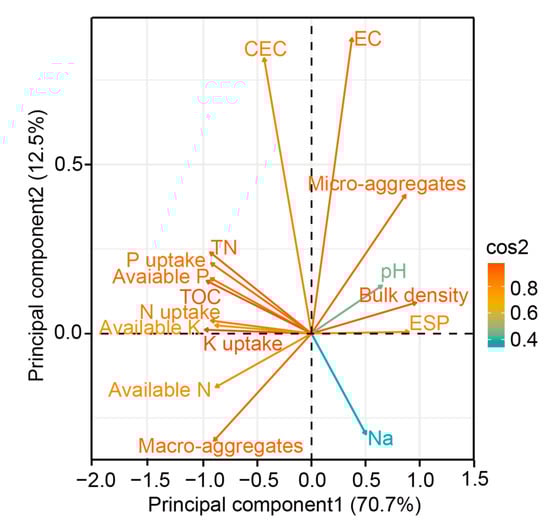 Principal component analysis (PCA) of nutrient uptake and soil properties in saline soil. Cos2 represents the quality of variations in the PCA, and a higher value of cos2 indicates a larger contribution of variation to the principal component.