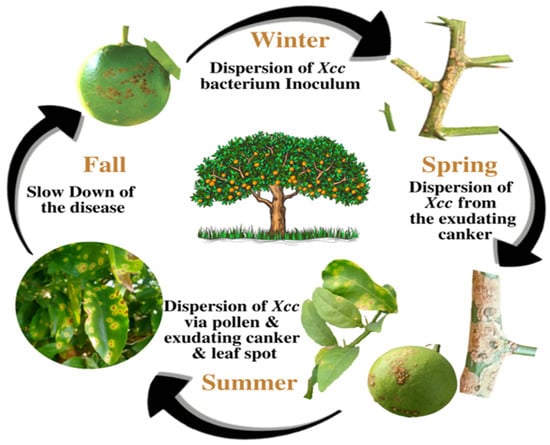 Canker-infected branches, leaves, and twigs are the primary sources of inoculums for the Xcc [112]. Long-term survival of the bacteria is possible in cankers on twigs and branches, acting as a primary inoculum source [125]. Additionally, infected leaves may act as a potential source of inoculums for Xcc despite the fact that these leaves tend to drop off quickly [2]. It has been demonstrated that the bacterium can survive for 6 months in contaminated leaves, for 52 days in sterilized soil, and for only 9 days on non-sterile soil [126,127]. Furthermore, studies suggest that Xcc can endure desiccation at 30 °C for 11–12 days [127]. Xcc bacterium have been found to live epiphytically on citrus hosts with low populations, causing symptoms along with non-host weeds, grasses, and soil [128,129,130]. However, saprophytic presence of soil pathogens has not been observed in the absence of plant tissue or debris [128,129]. When placed on inert surfaces such as fabric, metal, plastic, or treated wood, the bacterial inoculums die within 24 to 72 h, regardless of shade or sun exposure [125]. After leaves or fruits fall to the ground, the bacterial population is reduced to undetectable levels within 1–2 months due to competition with saprophytic microbes and other antagonistic interactions [130]. There have been reports of Xcc surviving for a few weeks under diseased trees that have been removed in Japan and Brazil on non-host plant matter, as well as in the rhizoplane of some weeds [131] (Figure 4).