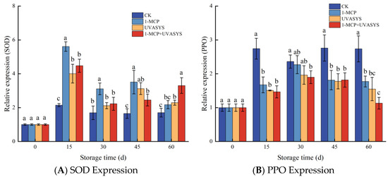 The change in SOD gene expression coincided with the change in SOD activity over storage, showing an initial increase and then a decrease (Figure 6B and Figure 8A). SOD gene expression could be induced by 1-MCP and UVASYS treatment compared to CK treatment during late storage, and 1-MCP + UVASYS treatment exceeded CK treatment significantly. The results showed that 1-MCP and UVASYS treatments could increase SOD activity by inducing the expression of the SOD gene. The amount of PPO gene expression tended to increase during storage (Figure 8B), in which CK treatment significantly exceeded other treatments in the late storage period, suggesting that 1-MCP and UVASYS treatment could inhibit PPO gene expression, in which 1-MCP + UVASYS treatment was only 41.33% of CK at 60 days. This is consistent with the significantly lower PPO activity observed in the 1-MCP + UVASYS treatment compared to the CK treatment during the later stage of storage (Figure 4B). The expression of the APX gene is shown in Figure 8C. During storage, the 1-MCP and UVASYS treatments both significantly increased the expression of the APX gene compared to the CK treatment, and late storage was significantly different between the two treatments. This result is consistent with the fact that 1-MCP + UVASYS treatment can maintain APX activity well during the later stage of storage and is significantly higher than that of the CK treatment (Figure 6C and Figure 7C). The change trend of PAL gene expression during storage is consistent with that of PAL activity (Figure 7C and Figure 8D). Specifically, 1-MCP + UVASYS treatment was significantly lower than CK treatment in the late storage period. The POD gene expression amount during storage is shown in Figure 8E. In the late storage period, 1-MCP and UVASYS significantly reduced the relative expression amount of POD compared to the CK control group. This result was also consistent with the inhibition of PAL and POD activities observed in bamboo shoots treated with 1-MCP + UVASYS during the later stage of storage.