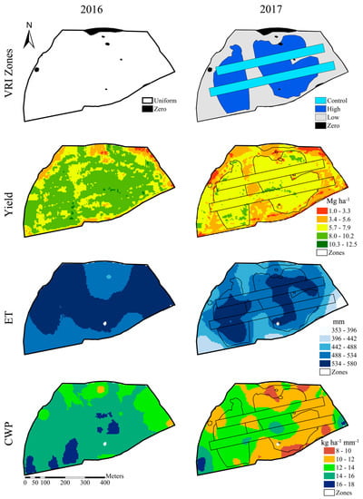 Variable rate irrigation (VRI) zones (first row), spatially variable wheat yield (second row), evapotranspiration (ET) (third row), and crop water productivity (CWP) (fourth row) for 2016 and 2017. These data were used to create the irrigation management zones for 2019.
