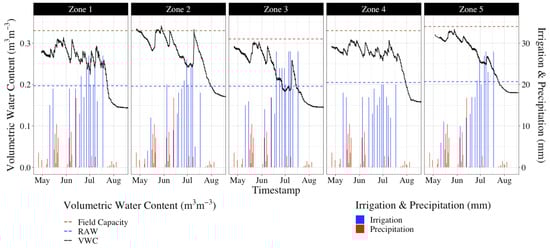 Variable irrigation rates in 2019 were determined from observed VWC values from installed soil sensors and zone-specific average FC values. Temporal changes in soil-sensor VWC for each zone are depicted in Figure 3.