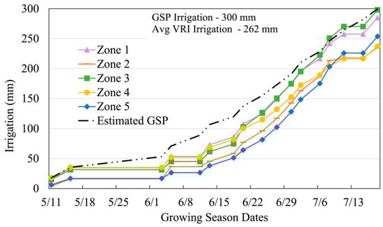 When the field was irrigated to FC within each zone, total water applied was reduced. Although the zones were irrigated at rates greater than the estimated GSP at different times within the growing season, this was performed (Figure 4) to avoid bringing the plants into a state of crop stress where yield is negatively affected. All zones showed lower cumulative irrigation compared to total estimated GSP, which resulted in water savings that are similar to other studies [,]. Managing VRI with zones that address the natural spatial variation of soil properties, such as FC, can result in water savings and has been noted to be valuable [,].