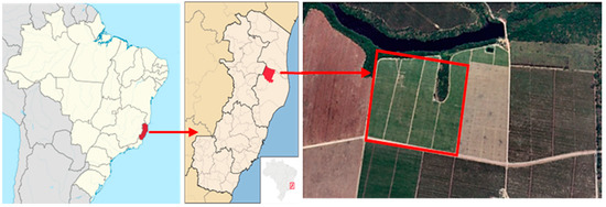 The research was conducted on a commercial farm, located in the district of Barra Seca, municipality of Sooretama, State of Espírito Santo, Brazil (Figure 1). The geographic coordinates of the experimental site are 19°07′56″ S and 40°06′51″ W. According to the Köppen classification, the climate of the research region is hot and humid, with a dry season in autumn–winter and a rainy season in spring–summer, type Aw [34].
