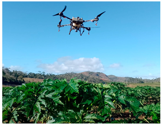 Agricultural operations related to pest and disease controls by unmanned aerial vehicles is an emerging operational technique in many countries, and especially in Brazil and Latin America as a whole, such technique has been progressing more intensively in the last six years. This technique, when compared with ground applications, has a number of advantages related to social, environmental, and economic sustainability. The application technology through unmanned aerial vehicles (UAVs) is based on the use of pre-programmed flight plans, controlled by an autonomous operator in a ground station, and the equipment consists of a rotor, tank, spraying system, control system, environmental sensor, and power system, among others [10]. Compared to conventional ground and air applications, UAVs stand out due to the following advantages: ultra-low volume of solution, water saving, no need for a landing strip, less risk of pilot contamination [11,12,13], and no limitations on terrain shape, field size, crop pattern, and turning space [14].