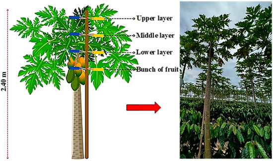 Before the applications, a polyvinyl chloride (PVC) rod was positioned on each plant, 3.6 m-long, used to fix the labels and artificial targets using a wooden nail at four different heights: top layer, middle layer, and bottom layer of the papaya canopy, and on the fruit clusters (Figure 4), respectively. Each treatment had 6 stems on 6 plants, each stem with 4 labels and 4 artificial targets, amounting to 24 sensitive paper labels and 24 PVC artificial targets per treatment.
