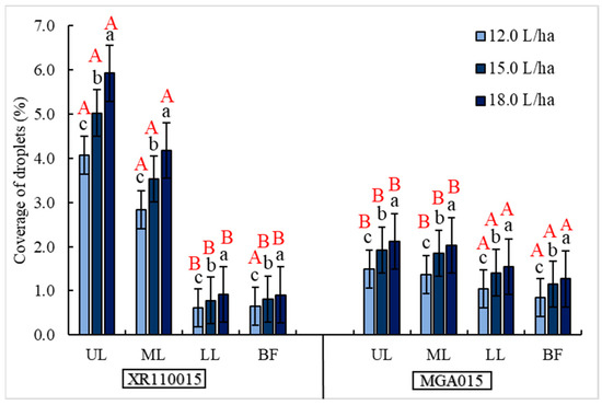 Conversely to XR110015, MGA015 showed less droplet coverage in the upper and middle layers, but more coverage in the lower layer and on papaya fruit clusters. The increase in droplet coverage in the lower layer when 18 L ha−1 was applied was 43.75%, and 42.85% and 40.0% at rates of 15.0 and 12.0 L ha−1, respectively, compared to XR110015.