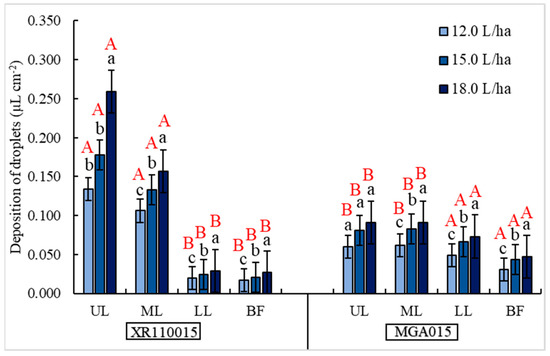 For the MGA015 nozzle, the highest deposition was also found in the upper layer (0.091 µL cm−2), when applied at a rate of 18.0 L ha−1. Using the same application rate, the lowest droplet deposition was on the fruit clusters (0.047 µL cm−2), showing a significant difference of 0.044 µL cm−2, equivalent to 48.35%.