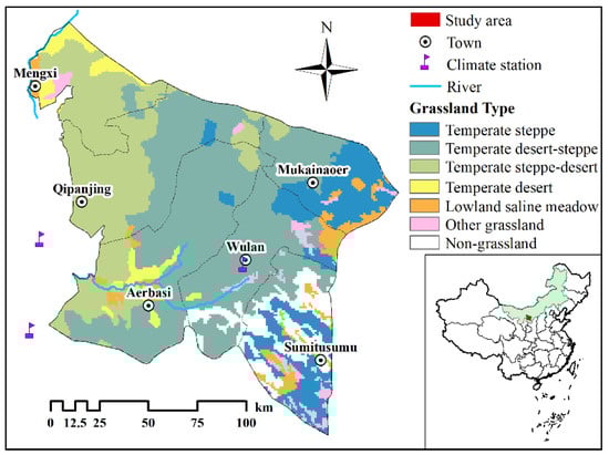 Otog Banner (106°41′ E~108°54′ E, 38°18′ N~40°11′ N, Figure 1) is located at the southwest of Ordos City, Inner Mongolia Autonomous Region, China, with a total area of 2.04 × 104 km2. The altitude ranges in 962~2063 m, gradually decreased from the northwest to the southeast. The climate is dry, with little rain, windy and sandy, with rich sunshine and strong evaporation, belonging to a typical temperate continental climate. The mean annual values of temperature, evaporation, and precipitation were 7.7 °C, 1721.1 mm, and 241.2 mm. The annual precipitation is concentrated from May to September, with extremely uneven spatiotemporal distribution. Otog Banner has about 1.92 × 104 km2 natural grassland, accounting for 93.55% of the whole banner area. The natural grassland types mainly include temperate steppe (13.03%), temperate desert-steppe (45.04%), temperate steppe-desert (24.31%), temperate desert (3.63%), lowland saline meadow (4.89%) and other types of grassland (2.65%), of which the first three types account for 88.06% of the total area of natural grassland in Otog Banner.