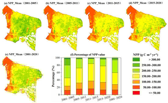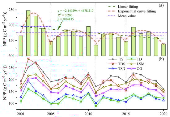 The spatial distribution of grassland NPP in Otog Banner is shown in Figure 4. Grassland NPP increased evidently from the west to the east of the study area, ranging from 17.48 to 498.09 g C m−2 yr−1 (Figure 4e,f). The area with NPP in the range of 150.00–250.00 g C m−2 yr−1 accounted for 66.49% of the total grassland area, where the main grassland type was TDS distributed in the middle of the study area. The area with NPP below 150.00 g C m−2 yr−1 accounted for 27.85% of the total grassland area, where the main grassland types were TD and TSD distributed in the west of the study area. While the area with NPP above 250.00 g C m−2 yr−1 only accounted for 5.67% of the total grassland area, where the main grassland types were TS and LSM distributed in the east of the study area. As can be seen from Figure 4a–d,f, in the recent 20 years, grassland NPP of Otog Banner had a decrease trend, and the low NPP area spread from west to east. During 2015–2020, the decrease process eased slightly, indicating that a series of policies implemented by the state for grassland protection and restoration since the 21st century had gradually achieved positive effects after 2015.