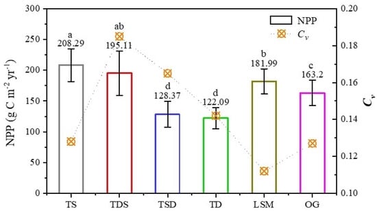 Mean annual values and variation coefficients () of NPP for different grassland types in Otog Banner. Temperate steppe (TS), Temperate desert-steppe (TDS), Temperate steppe-desert (TSD), Temperate desert (TD), Lowland saline meadow (LSM), Other grassland (OG). Different small letters meant significant difference at 0.05 level.