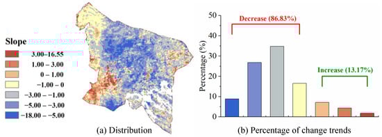 The changing trend of NPP for individual pixel in Otog Banner from 2001 to 2020 is shown in Figure 6. The change rates of grassland NPP ranged from −18.00–16.54 g C m−2 yr−1. The decrease area of grassland NPP reached 86.83% of the total grassland area. The area with change rates of −1.00–−5.00 g C m−2 yr−1 accounted for 61.49% of the total grassland area, where the main grassland type was TDS that distributed in the middle of the study area. Whereas, the increase area of grassland NPP only accounted for 13.17% of the total grassland area, where the main grassland type was temperate steppe-desert that distributed in the southwest.