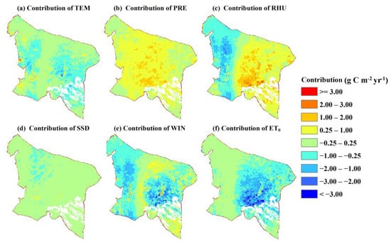 Spatial responses of grassland NPP to different climate factors, namely, (a) Temperature (TEM), (b) precipitation (PRE), (c) Relative humidity (RHU), (d) Sunshine duration (SSD), (e) Wind speed (WIN), (f) Reference evapotranspiration (ET0).