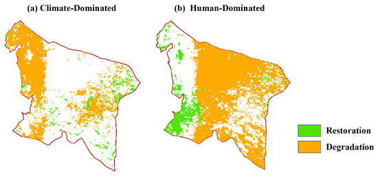 - The overall degradation of the grassland in Otog Banner was the joint result of CC and HA. The climate-dominated degradation was mainly distributed in the west and accounted for 29.97% of the total grassland area; while the human-dominated degradation was mainly distributed in the middle and east and accounted for 56.86% of the total grassland area.