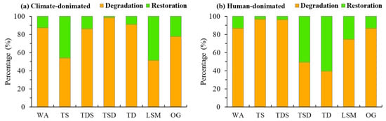 On the basis of Figure 9 and the assessment criteria designed in Table 3, the restoration and degradation areas dominated by CC and HA were determined (Figure 10 and Figure 11). The climate-dominated grassland area was only about half of the human-dominated grassland area (34.37% vs. 65.63%), and the impacts of both CC and HA on grassland degradation was much greater than those on grassland restoration (climate-dominated degradation vs. climate-dominated restoration: 87.20% vs. 12.80%, human-dominated degradation vs. human-dominated restoration: 86.84% vs. 13.36%). Moreover, the grassland was dominated by the degradation process as a whole in the study area, and the degradation areas dominated by CC and HA accounted for 29.97% and 56.86% of the total grassland area, respectively. In terms of different grassland types, the degradation area was larger than the restoration area for each grassland type in the climate-dominated area, especially for TDS, TSD, TD, and OG. In the human-dominated area, the percentages of degradation were much larger than those of restoration for TS, TDS, LSM, and OG, while the percentages of degradation were slightly lower than those of restoration for TSD and TD.