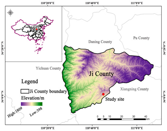The study area was located in Jixian County (110°26′28″–111°07′21″ E, 35°53′13″–36°21′03″ N), Linfen City, Shanxi Province, China (Figure 1), and is a typical loess gully region with poor soil and organic matter content levels below 1%. It has a temperate continental climate. The annual average precipitation is 576 mm and 61.8% occurs between June and August; the annual average evaporation is 1723.9 mm; the annual average frost-free period is about 170 days; the average temperature is 10 °C; and the average accumulated temperature is 3357.9 °C. The average soil bulk density in the 0–60 cm layer is 1.26 g/cm3 and the average field water capacity is 27.05%. During the growth period for soybean, the temperature and rainfall generally show a trend of first rising and then decreasing from the podding stage to the filling stage (Figure 2). The average temperature during the growth period is 19.5 °C and the total rainfall is 195 mm. It is mainly fall during the branching and filling stages and accounts for 75.6% of the total rainfall over the growth period. The total irrigation amounts for the W1 (60% field capacity (Fc)), W2 (75% Fc), and W3 (90% Fc (W30) treatments were 21.57 mm, 21.56 mm, and 20.34 mm, respectively, at the podding stage. During the filling stage, the total irrigation amount was 23.54 mm in W1, 26.52 mm in W2, and 22.02 mm in W3.