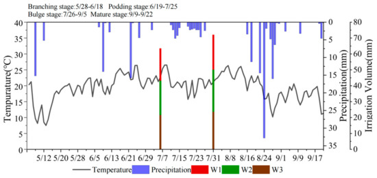 Precipitation and temperature during co-growth period of the apple and soybean. Notes: W1, W2, and W3 are the irrigation volumes for the three irrigation gradients; all meteorological data are for the year 2022.