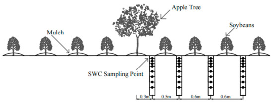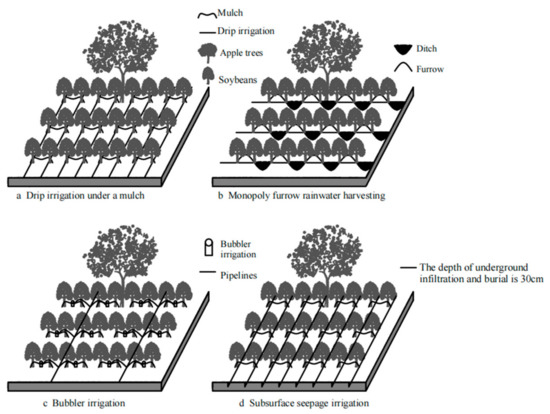 Rainfall in the Loess Plateau, west Shanxi Province, China, is limited and unevenly distributed. Fruit–crop intercropping can reduce evaporation and promote rainwater retention and infiltration, which improves the soil water environment. However, intercropping transpiration may increase the soil water consumption and intensify interspecific water competition, which reduces the system productivity and the economic benefits [1,2]. There are many types of intercropping systems used In the Loess region, but the most widely used is the apple–soybean intercropping model, because an agroforestry system with leguminous crops as the intercropping material can not only improve water utilization but also improve nitrogen uptake, which is beneficial for apple growth. However, fruit trees and crops have different degrees of resource competition due to ecological niche overlap. This competition is mainly manifested as water-resource competition [3]. In order to alleviate water competition among species, some fruit farmers collect rain using ridgeways. However, ridgeway harvesting is limited by the temporal and spatial distribution of rainfall and rainfall intensity and is also affected by the underlying surface of the ridge. When there has been no effective rainfall for a long time, a water deficit in the intercropping system will occur. This water deficit leads to more intense interspecific water competition between the apple and soybean, which results in poor growth of the soybean, lower yields, and reduced economic benefits. Long-term interspecific competition for water resources will aggravate the soil nutrient deficits and soil degradation, which will ultimately affect the sustainable development of the agricultural and forestry economy across the whole region.