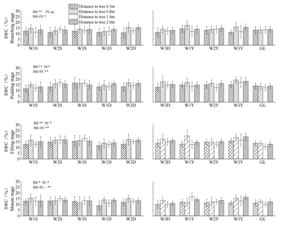 In the horizontal direction (Figure 5), the average soil water content in the 0–120 cm soil layer increased at first, then decreased, and then increased as the distance from the trees increased and the trend was most obvious at the flowering and podding stage. Under the different micro-irrigation methods and irrigation volumes, most of the lowest SWCs appeared at 0.3 m away from the tree and the SWCs only slightly varied under the different treatments. The overall order for the soil water contents at the different growth stages was flowering and podding stage > bulging stage > mature stage > branching stage and the soil water content at the bulging stage increased by 13.6% compared to the other growth stages, with the exception of the flowering and podding stages. Under the same irrigation method, the soil water content increased as the irrigation level rose, especially in subsurface seepage irrigation. There was also an increase at the flowering and podding stage and in the soil water content, which increased by 18.6% and 4.0% in W2S and W3S, respectively, compared to W1S. Under the different micro-irrigation methods at the same irrigation level, the soil water content with bubbler irrigation was mostly higher than that of the other two micro-irrigation methods, with a maximum increase of 17.5%. The soil water content of the micro-irrigation treatment was significantly higher than that of the GL treatment, with a maximum increase of 36.1% compared to the GL treatment.