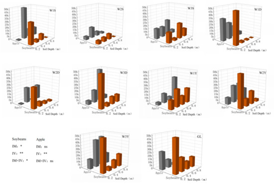 Soybean and apple vertical root length density diagram. Note: * indicates significant correlation (p < 0.05); ** is highly significant (p < 0.01);ns is insignificant correlation (p > 0.05). IM is irrigation method and IV is irrigation volume.