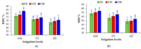 Leaf integrity parameters (RWC and MSI) represented in Figure 1a,b were significantly affected in correspondence to the water and compost treatments. The maximum values of RWC (83.34%) and MSI (73.84%) were observed for non-drought-stressed and high-rate compost-amended plants. The reductions in RWC and MSI were 12.75% and 28.35%, induced by increasing water stress severity from I100 to I50. On the other hand, compost application positively led to a significant improvement in leaf integrity. Under compost application (C30), the RWC and MSI were increased by 6.20% and 12.74%, respectively, compared to the control (C0).