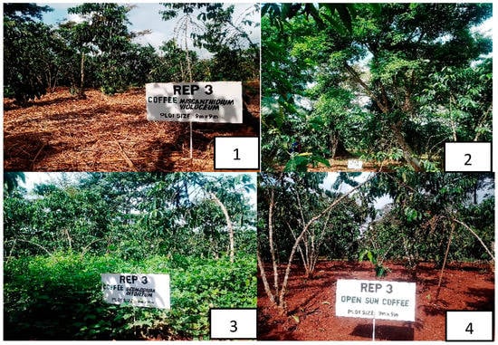 Robusta coffee growth parameters were not significantly (p > 0.05) different across the various SMCPs. Similarly, Chemura [77] and Atnafu [78] observed no significant differences in Arabica coffee grown under different soil fertility management options. In the dry season, all the growth parameters were higher for Robusta coffee growing under SMCPs compared with coffee growing under the open sun system. SMCPs have been reported to improve coffee growth parameters, such as, for example, [79,80,81,82]. This is could in part due to the fact that the SMCPs improved soil physico-chemical properties and coffee plant nutrition, as observed in this study.