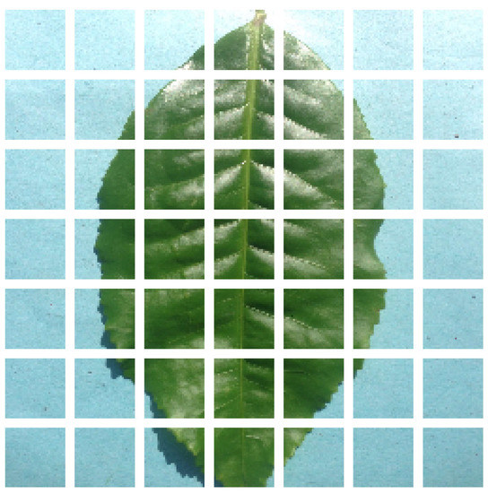 In Formula (2), k represents the gray value of the pixel (k = 255), and p(m) represents the probability density of the pixel m in the whole image. The image IE discussed in Formula (2) refers to the global IE, which represents the statistical distribution of all pixels in the whole image. Since the spatial distribution characteristics of image pixels are not considered, different images with the same probability distribution will have the same IE. In order to reasonably utilize the IE information of the image, the concept of unit IE is adopted in this paper [15]. Firstly, the grid descriptor is introduced. Figure 1 shows the grid description with a size of 7. As can be seen, by mapping the original tea disease image to the grid, a 7 × 7 units square matrix can be obtained. Based on the Formula (2), the global IE of each grid unit in Figure 1 can then be obtained, and the 7 × 7 IE matrix E shown in Formula (3) is obtained.
